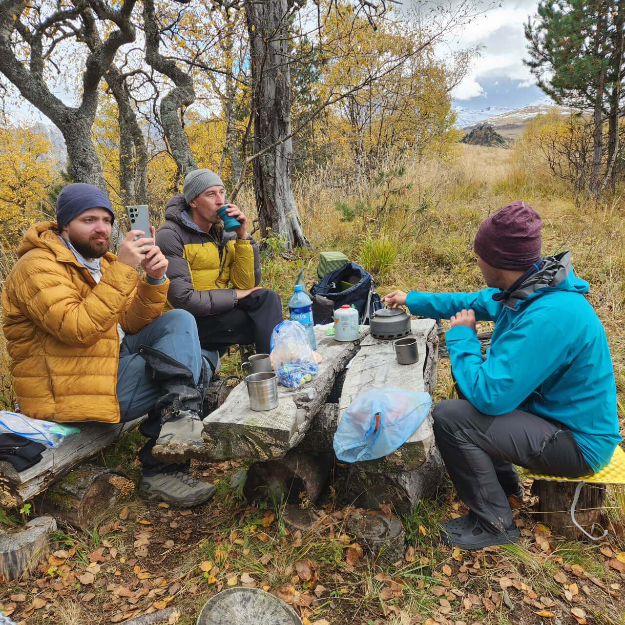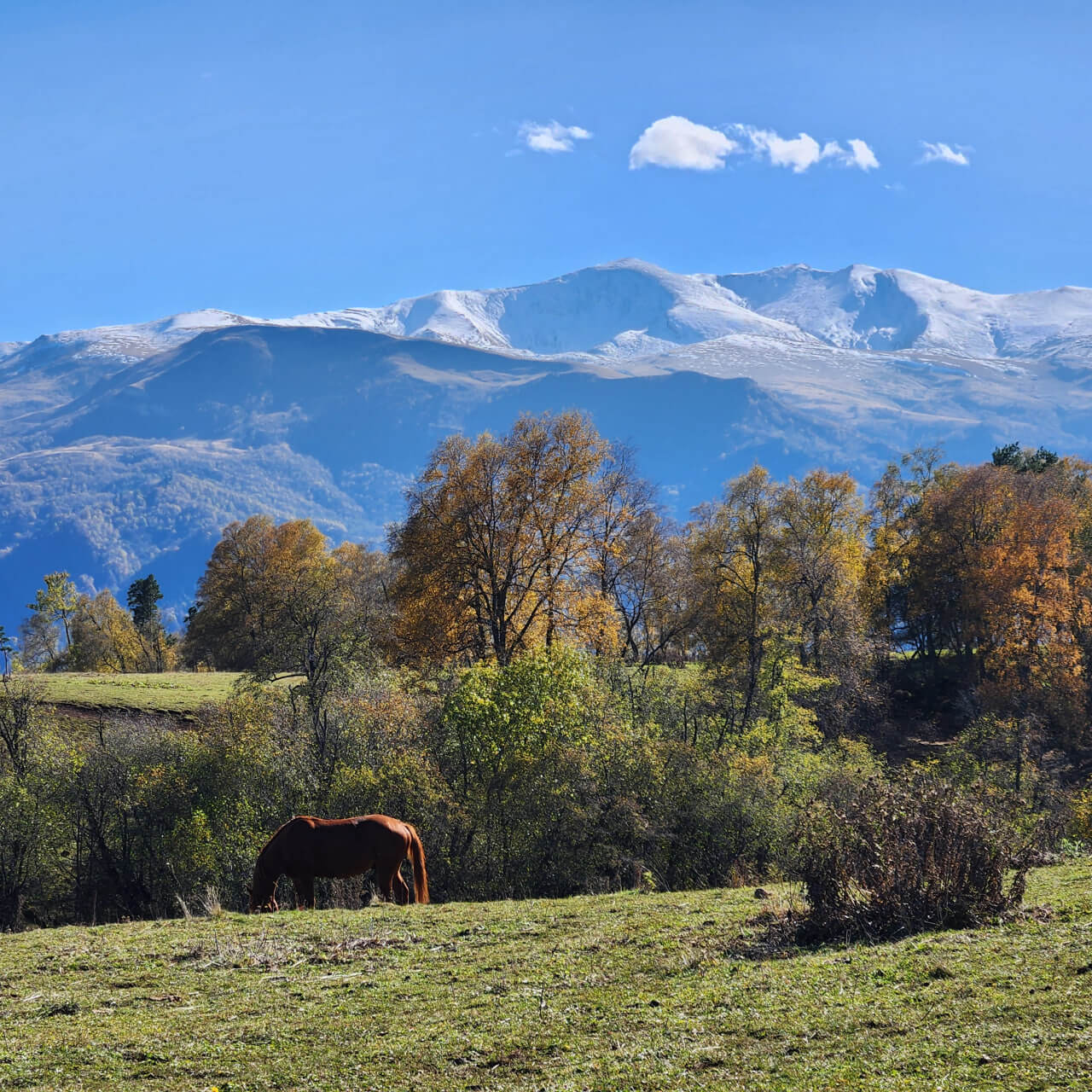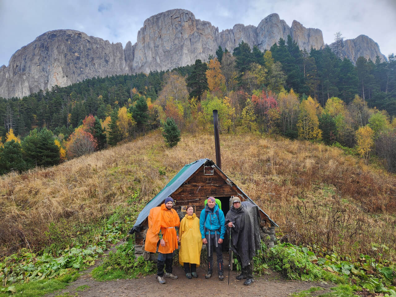Начинался наш пеший маршрут в районе села Рожкао около горы Дженту, куда мы добирались практически весь день 12 октября из города Армавир. До села Курджиново ехали на обычном автомобиле, дальше на камазе, поскольку больше ничего по этой дороге пройти не может. В пути основательно поливало дождем, глину под колесами развезло, машину периодически заносило… Казалось, еще чуть — чуть, и придется выгружаться в мокрую тьму, идти пешком. Но, благодаря опыту и мастерству водителя, все же доехали до балагана, в котором была запланирована первая ночевка. Как же мы радовались этому, слушая ночью завывание ветра и стук дождя по крыше. Утром, выйдя на улицу, увидели окрестные луга в снегу и полускрытые туманом горы. Пока завтракали и собирались, погода начала быстро меняться. Вышло солнце, облака поднялись… Перед нами открылись сияющие ослепительно белым снегом горные склоны, к которым почти вплотную подступают осенние «В багрец и золото одетые леса» (Александр Сергеевич Пушкин, стихотворение «Осень», 1833 год) — лучше поэта точно не скажешь.