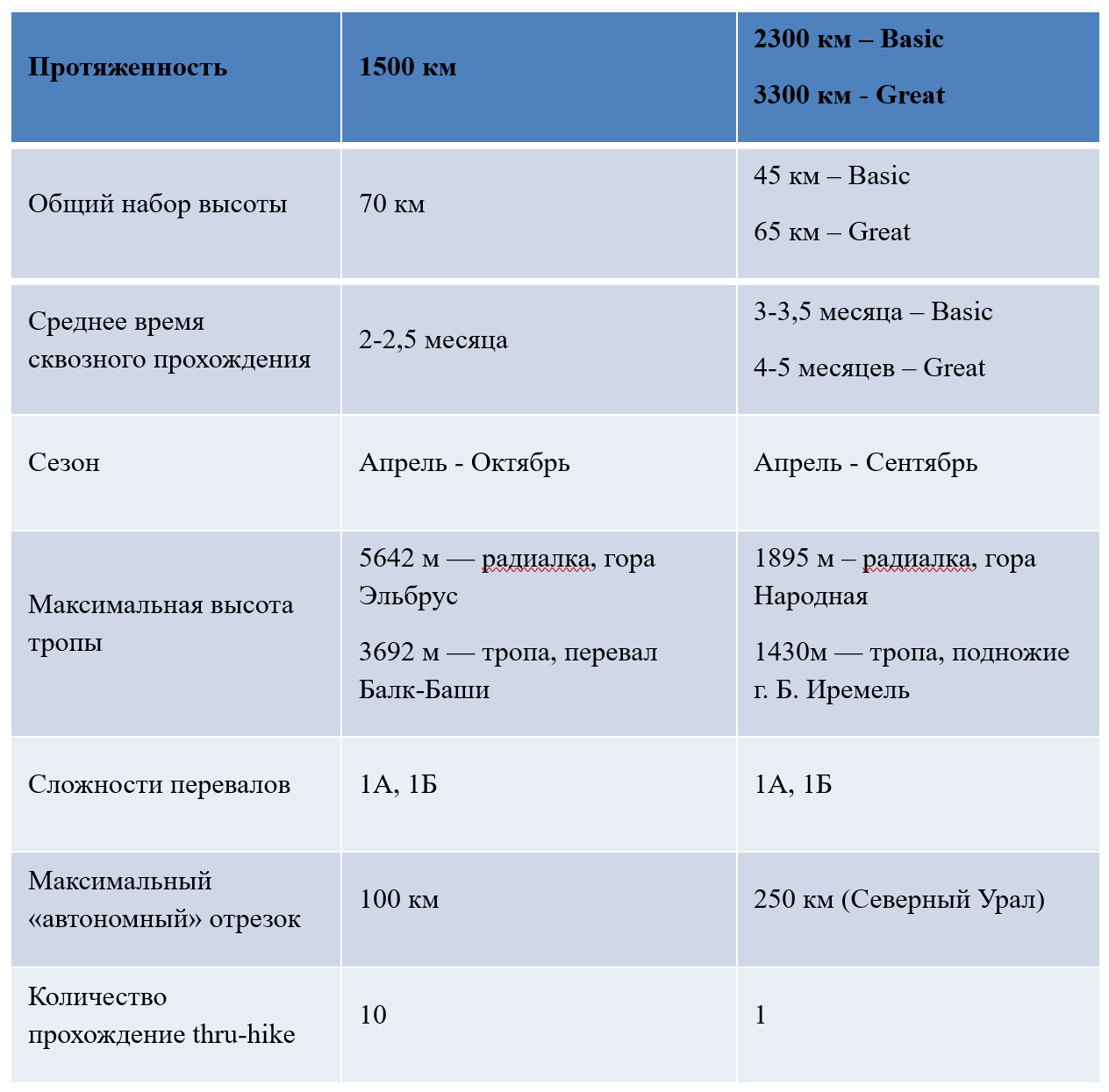 - предназначены для сквозного прохождения (thru-hike) — непрерывного прохождения от начала до конца в течение одного сезона;