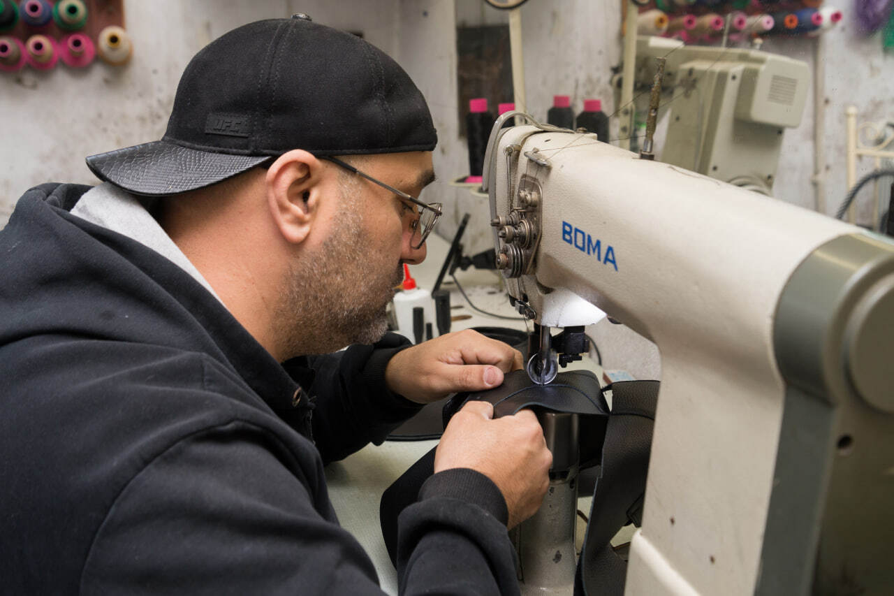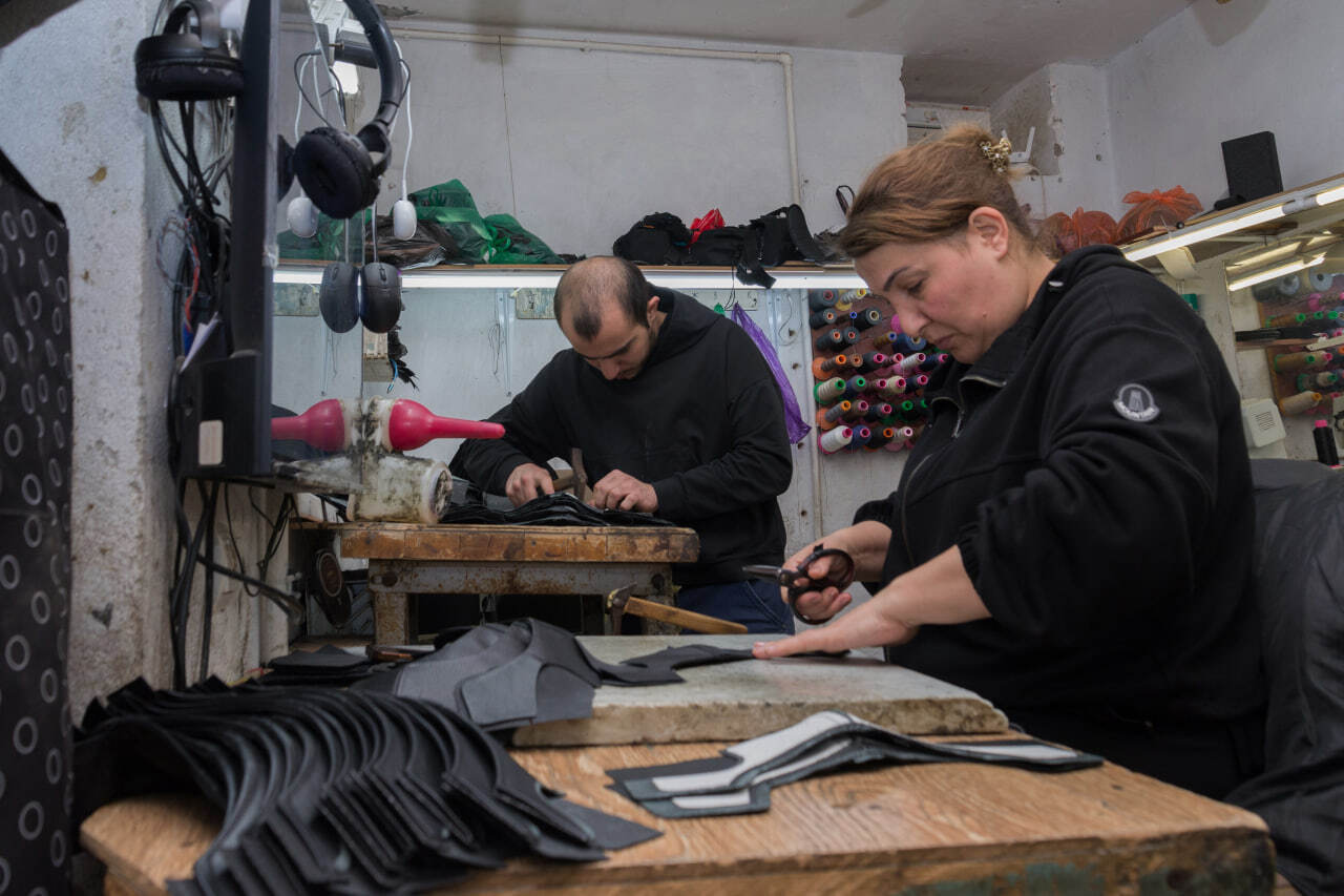 «Мы обувь шьём вручную, как конвейер: один кроит, другой подшивает, третий клеит. Так легче и быстрее бывает,» — говорит Ширин.